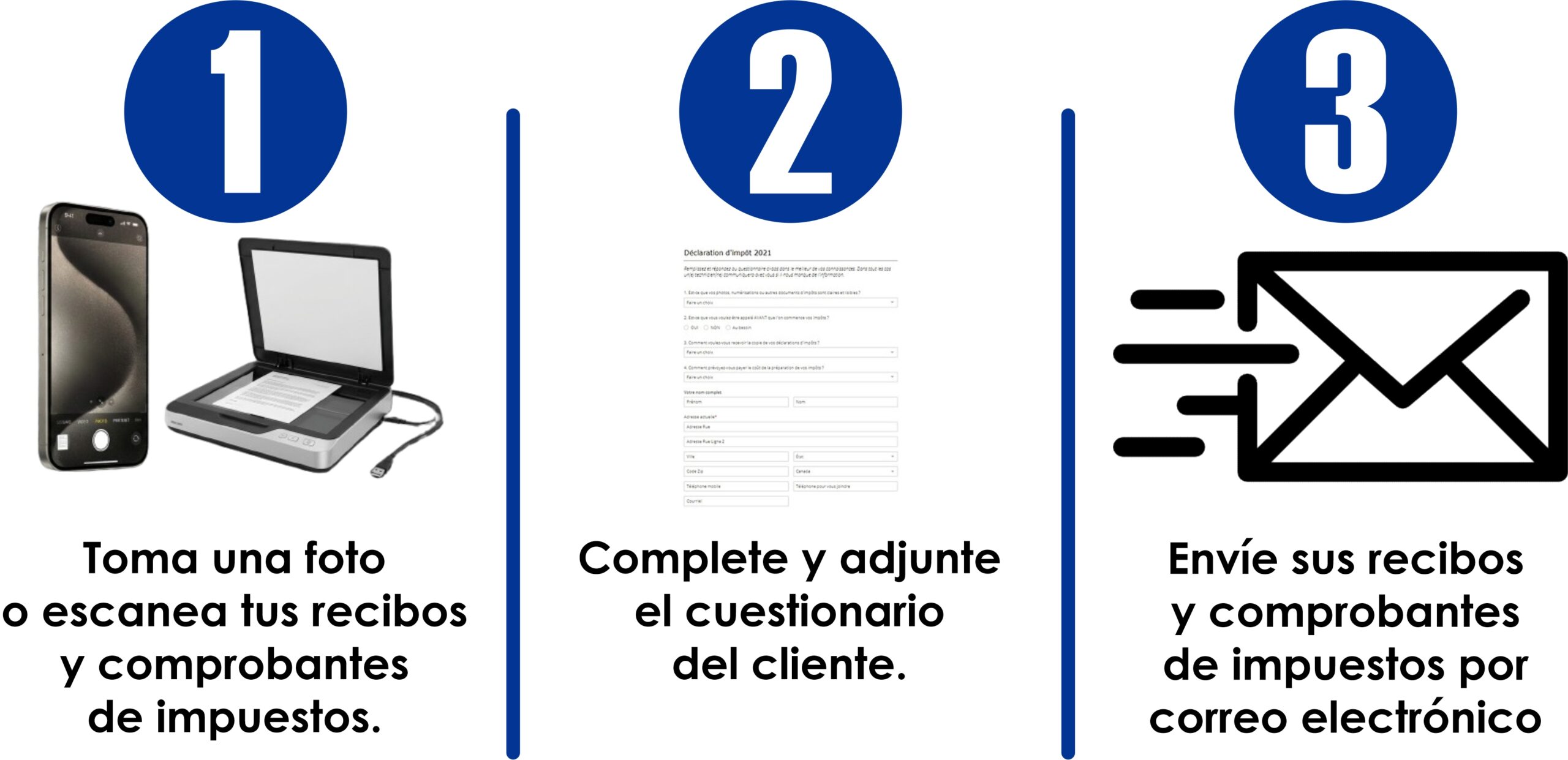 - Si es un cliente nuevo, por favor envíenos sus declaraciones de impuestos del año pasado (Formulario T1).